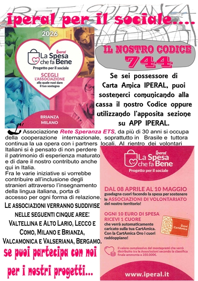 IPERAL PER IL SOCIALE.....SCEGLI RETE SPERANZA E SOSTIENI I NOSTRI PROGETTI CON IL NOSTRO CODICE 744